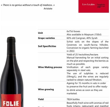 A crazy desire to please yourself and your guests? This blend of Mourvèdre and Grenache, elegant, gourmet and spicy, will accompany your dishes in sauces and red meats.