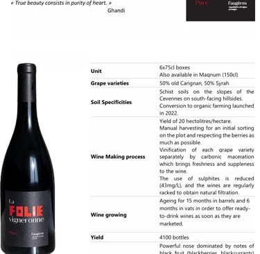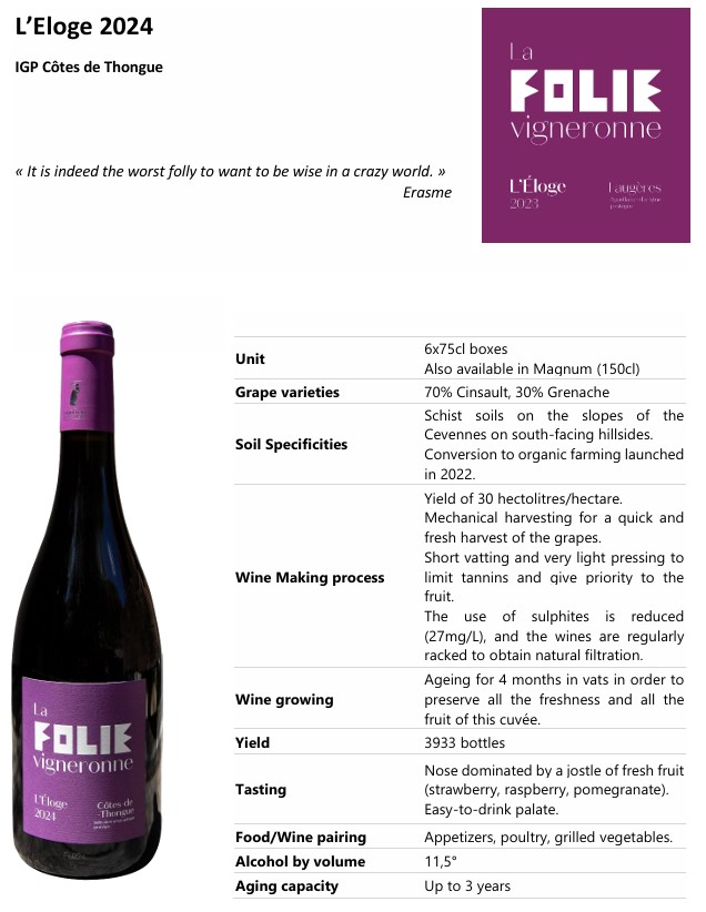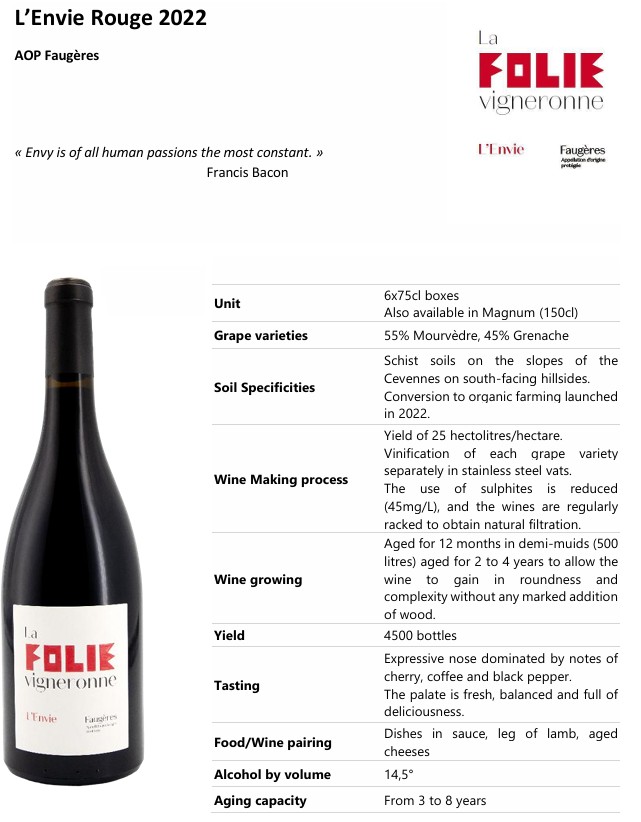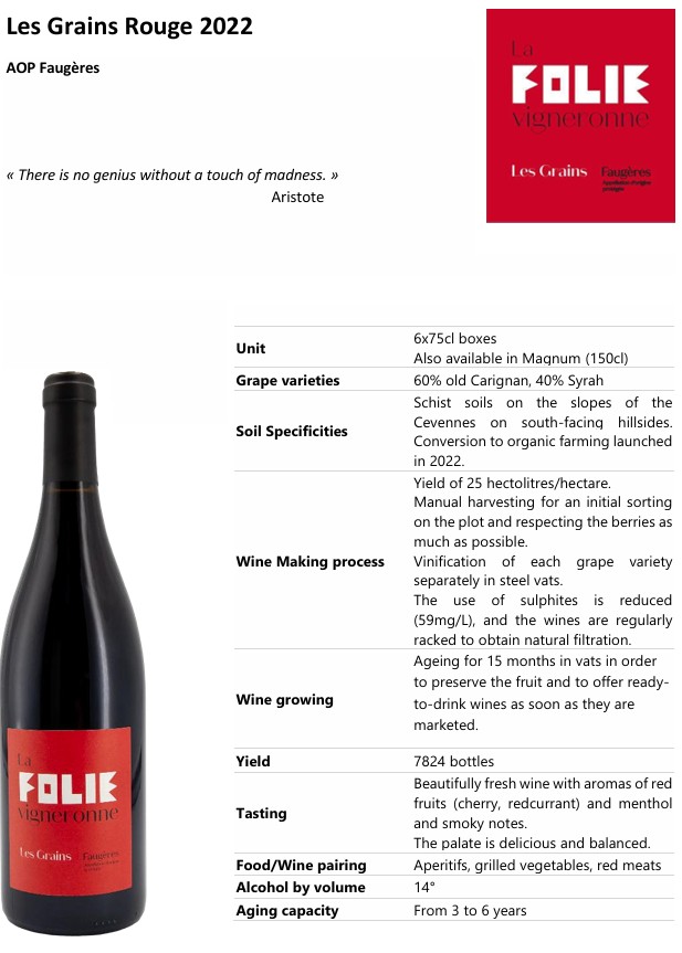 A sip of madness! Fresh, fruity and gourmet, this blend of old Carignan and Syrah will accompany your appetizers, grilled dishes and red meats.