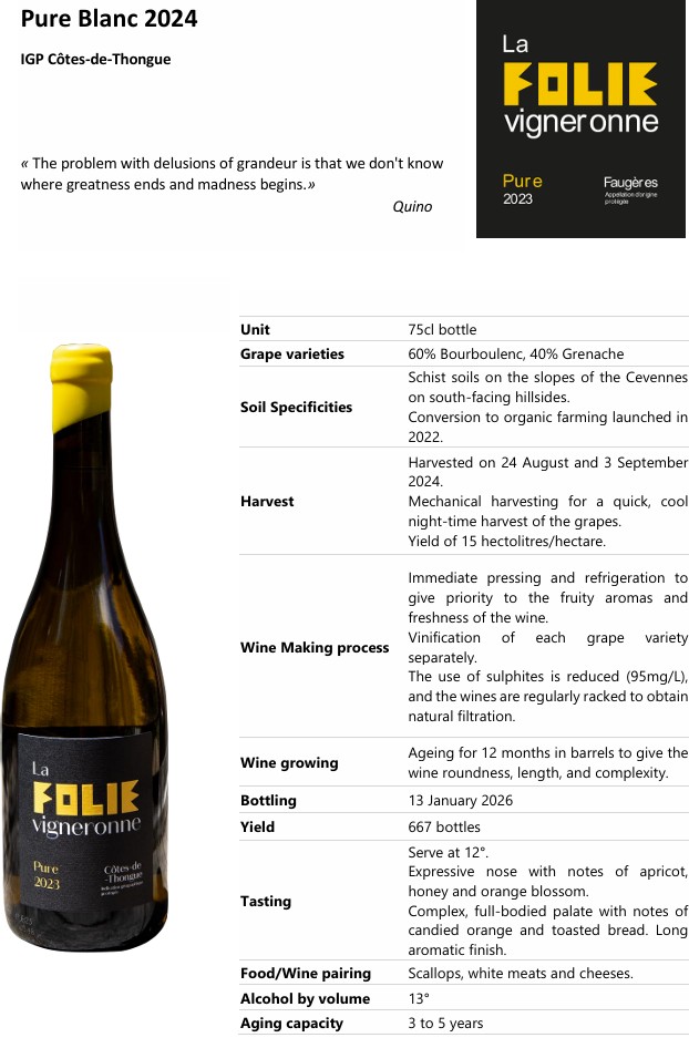 Our new great White wine, Pure selection of Grenache and Bourboulenc, aged 12 month in new French oak barrels.